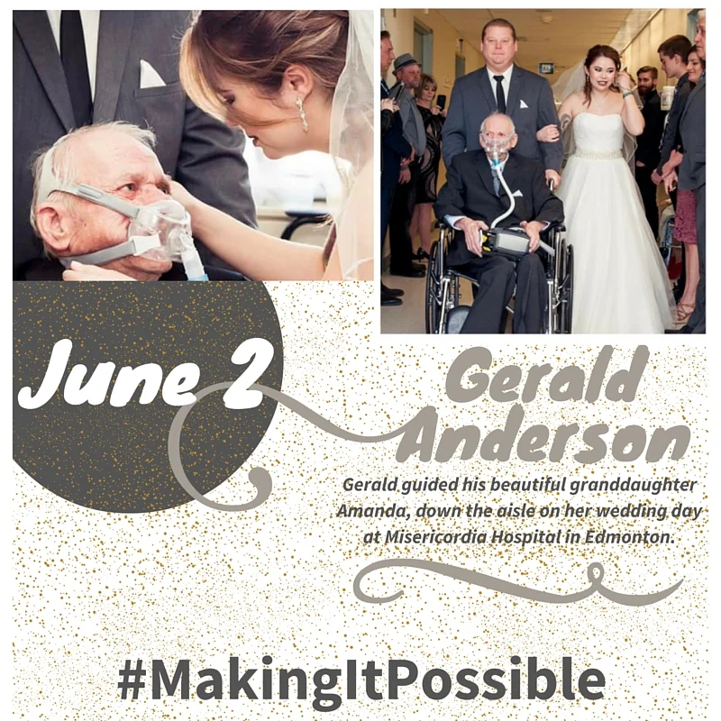 Gerald Anderson’s granddaughter, Amanda, played a very special role in his life. Amanda’s wedding day was nearing and she wanted nothing more than to have her papa (as she called him) walk her down the aisle on her wedding day. As Gerald’s diagnosis progressed, the wedding was set to take place at the Misericordia Hospital in Edmonton where he was being cared for. Amanda’s wedding day dream became a reality and her papa, Gerald, was able to guide her down the aisle on her special day. This is a truly inspiring story that shares how despite Gerald’s diagnosis, with the help from the Misericordia Hospital, the ALS Society of Alberta and Gerald Anderson’s friends and family, this special day and life lasting memory was made possible.